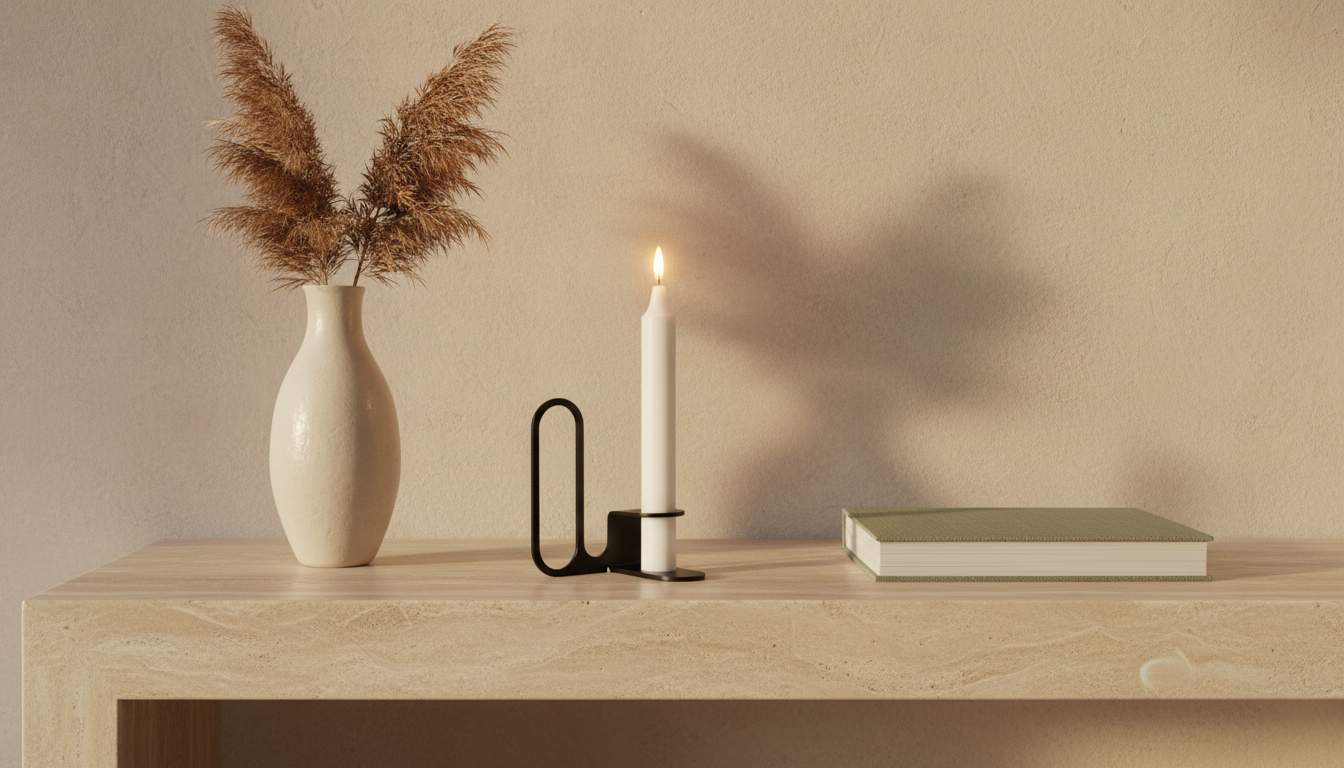 Sade çizgili, malzeme karakteri net, çevresindeki objelerle dengeli kullanılan bir metal mumluk çok daha zamansız görünür. Ahşap, seramik, cam ve keten gibi yüzeylerle birlikte kullanıldığında bu etki daha da güçlenir.